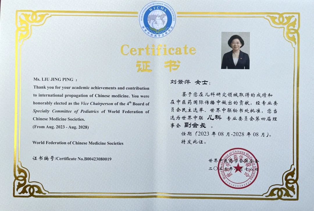 BG视讯药业集团党委书记、董事长刘景萍当选世界中医药学会联合会儿科专业委员会第四届理事会副会长